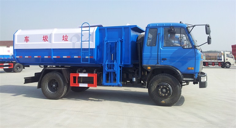 工作原理:自裝卸式垃圾車是由密封式垃圾廂、液壓系統、操作系統組成,能配幾十個垃圾桶,實現一車與多個垃圾桶聯合作業,廂體上的液壓升降裝置可將垃圾桶吊上、放下,上下升降,上下一次工作循環時間為50S,密封式廂體環保衛生,可避免二次污染。其自裝式的掛桶裝置可直接將路邊的垃圾桶掛在上面用提升機直接到在垃圾箱體里面省去了裝垃圾的麻煩。